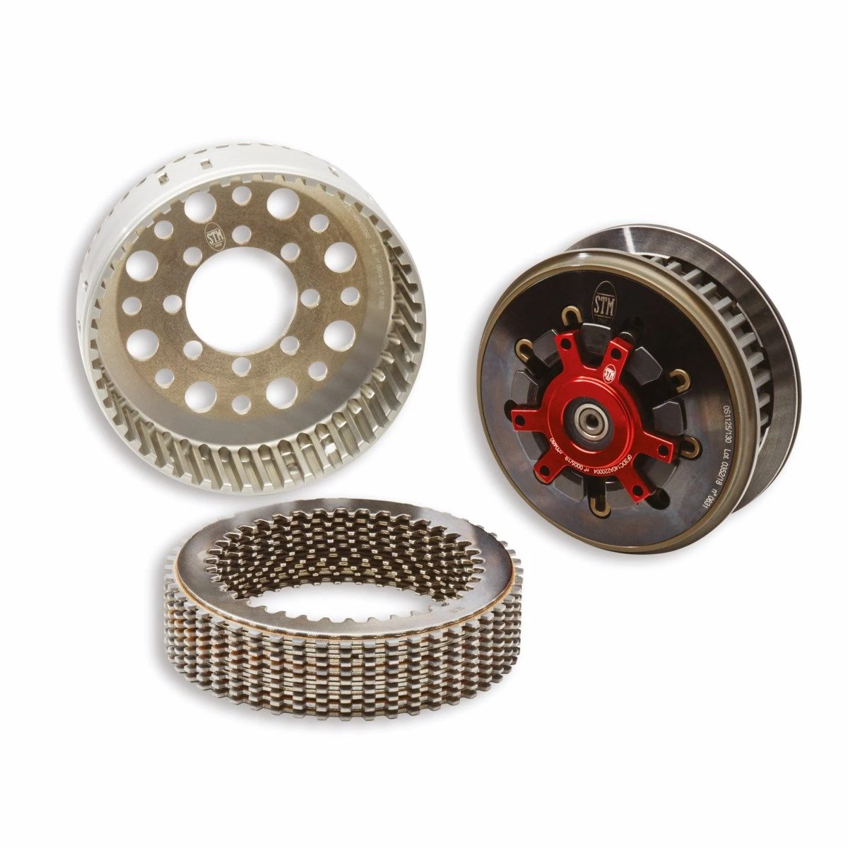 Net als in de MotoGP, waar topprestaties het enige zijn dat telt, wordt de droge koppeling beschikbaar gesteld voor de andere V4-modellen, die er niet standaard over beschikken. Dit is een STM EVO-SBK-koppeling gemaakt van billet aluminium met behuizing en 48-tands platenpakket. De platen zijn 9 gedreven en 9 gevoerd met een diameter van 138 mm. Bij racen op het circuit zijn er belangrijke voordelen in het gebruiksgemak. Met name de droge koppeling zorgt voor een effectievere slipperfunctie, zelfs tijdens de meest agressieve terugschakelingen, en voor een grotere soepelheid tijdens alle “off-throttle”-fasen. Bovendien kan het “mechanische” remniveau van de motor worden aangepast door een andere hulpveer te kiezen dan die uit de catalogus. Andere belangrijke voordelen zijn de afwezigheid van weerstand van de motorolie en schonere olie, aangezien het plaatslijtagestof niet in het smeercircuit wordt getransporteerd. Het racekarakter van de droge koppeling en het iconische geluid zijn opwindende extra voordelen voor de meest gepassioneerde Ducatista’s.