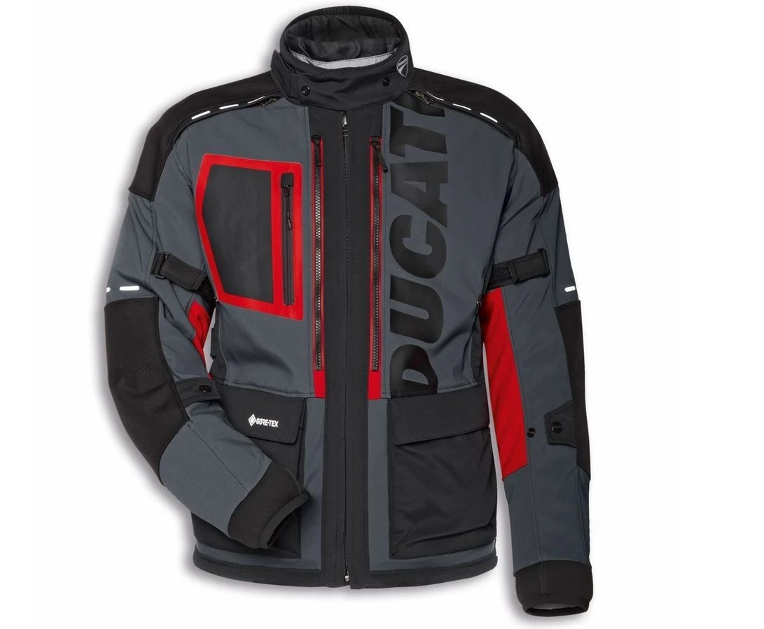 De Strada C5 Motorjas van Ducati bestaat uit een uitneembaar Gore-Tex®-membraan, duurzame, licht elastische en sneldrogende Mugello-buitenstof, een thermisch Primaloft Active Silver binnenjack dat zelfs los gedragen kan worden, ergonomische beschermingen op schouders en ellebogen, en een zak voor het plaatsen van een rugbeschermer.