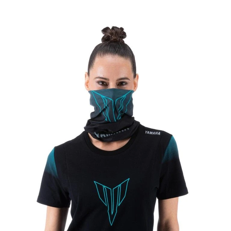 De Hyper Naked nekwarmer is de perfecte aanvulling op de volledige kledinglijn en is een zeer aanpasbaar item voor rijden op verharde wegen en verkennen in de buitenlucht. De uitvoering in polyester met ‘stealth’ zwart vervagend naar cyaan zorgt voor een zeer zacht gevoel dat de elementen buiten houdt. Een gesublimeerd MT-logo en het Yamaha-logo zorgen voor een stedelijke look die helemaal bij de Dark Side past.